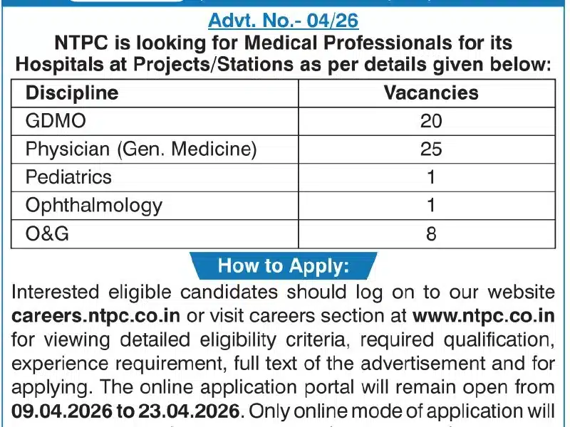 The NTPC Medical Professional Notification 2026 Out has been officially released, offering an excellent opportunity for qualified medical professionals across India. NTPC Limited has announced 55 vacancies under Advertisement No. 04/26 for various medical posts including GDMO, Physician (General Medicine), Pediatrics, Ophthalmology, and Obstetrics & Gynecology (O&G).
